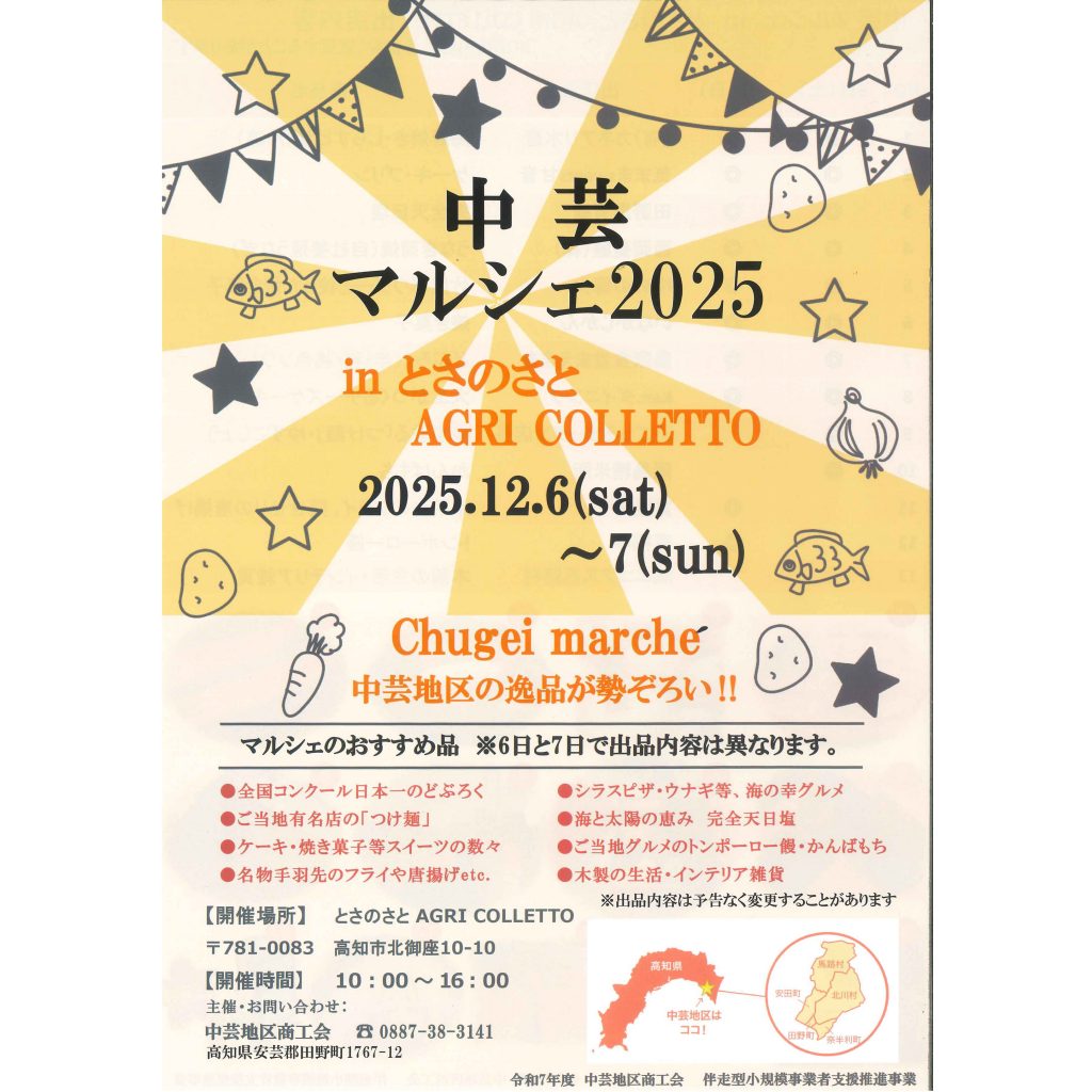 12月6日(土)、北御座にある、とさのさとAGRI COLLETOさんで、中芸マルシェ2025に出店しました。中芸とは、高知県東部にある、馬路村、安田町、北川村、田野町、奈半利町の5町村の地域になります。沢山のお客様に来ていただきました。色々とお客様とお話も出来き、楽しい時間になりました。本当にありがとうございました。そして、とさのさとAGRI COLLETOの皆様をはじめ、関係者の皆様ありがとうございました。